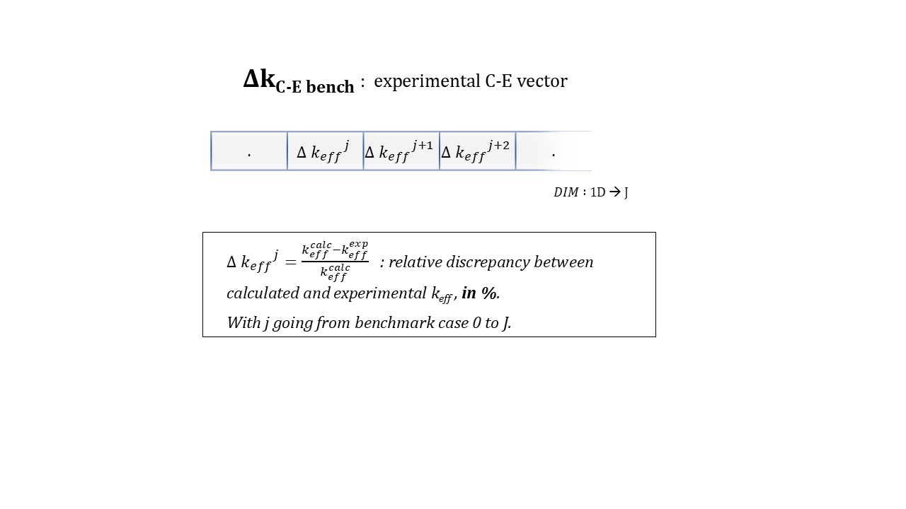 - a "C-E benchmarks vector" \(\Delta k_{C-E \text{ bench}}\) containing the relative response differences ((C-E)/C) of selected benchmarks;