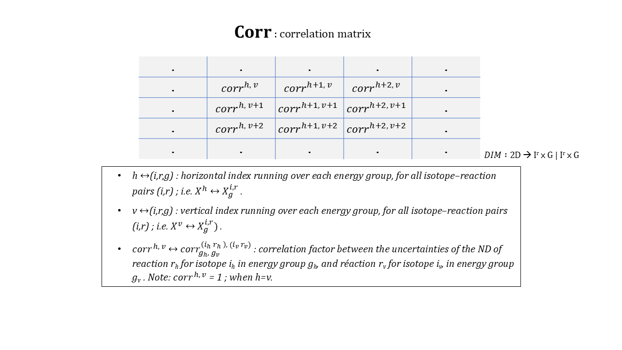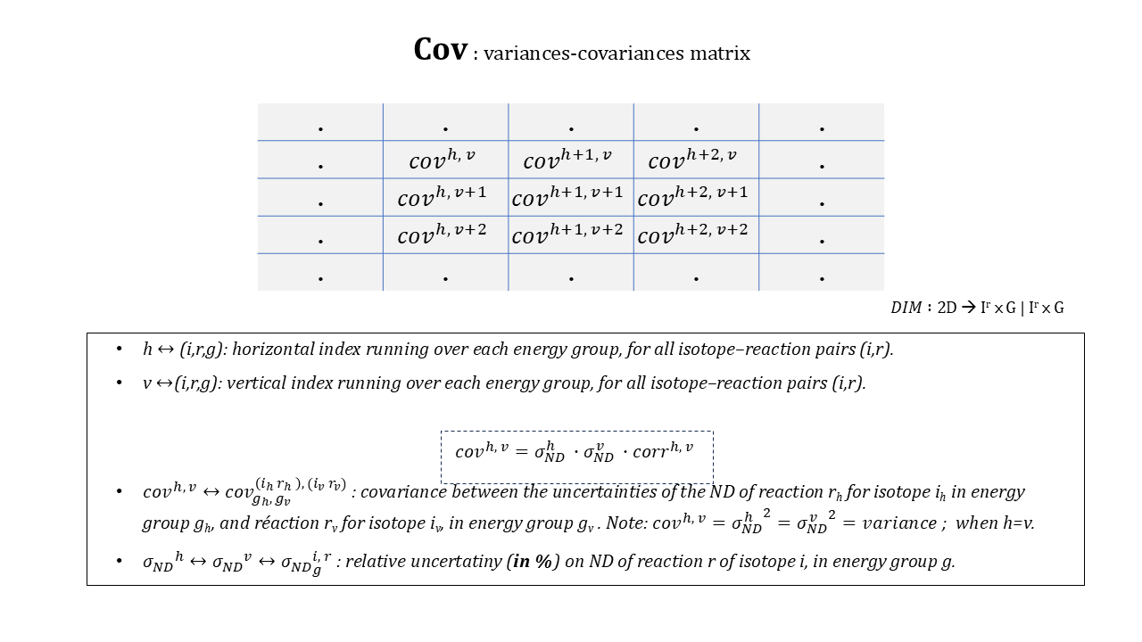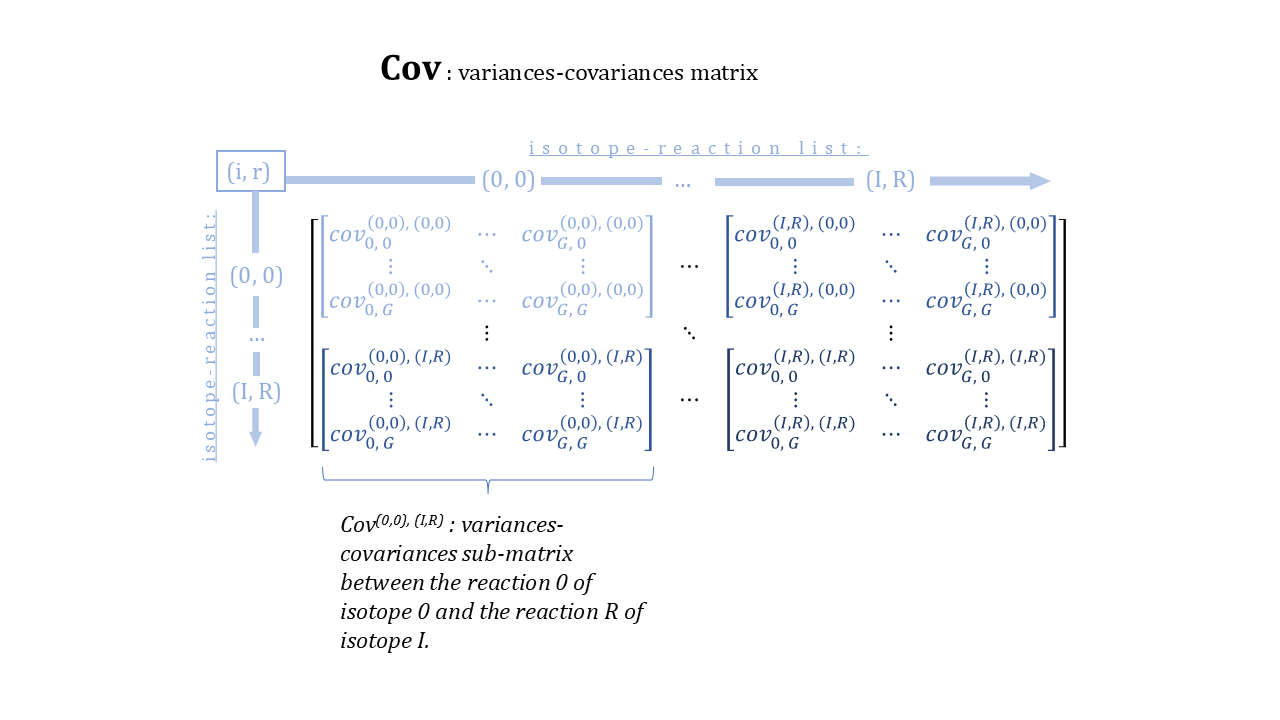 The covariance matrix can also be interpreted as a composition of covariances sub-matrices, for each pair of isotope-reaction couples, aligned horizontally and vertically: (ih, rh)-(iv, rv).